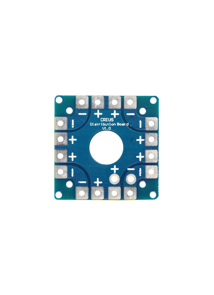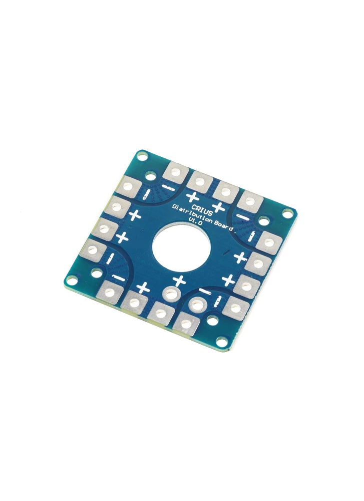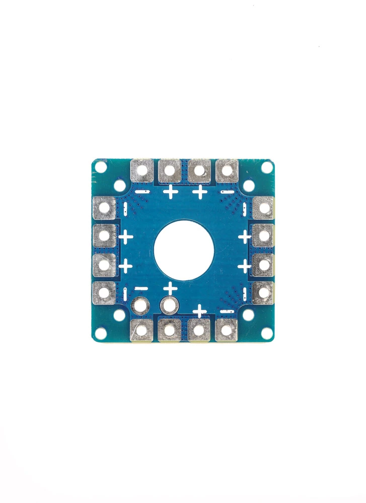 This is a straightforward 50mm square power distribution board with M3 mounting holes. It has 16 contacts (8 pairs on each side of the PCB) ready for you to solder your ESC conections to. The board is rated for 100A so it will suit small to medium size multirotors. For high current applications we recommend our 300A PDB – here.