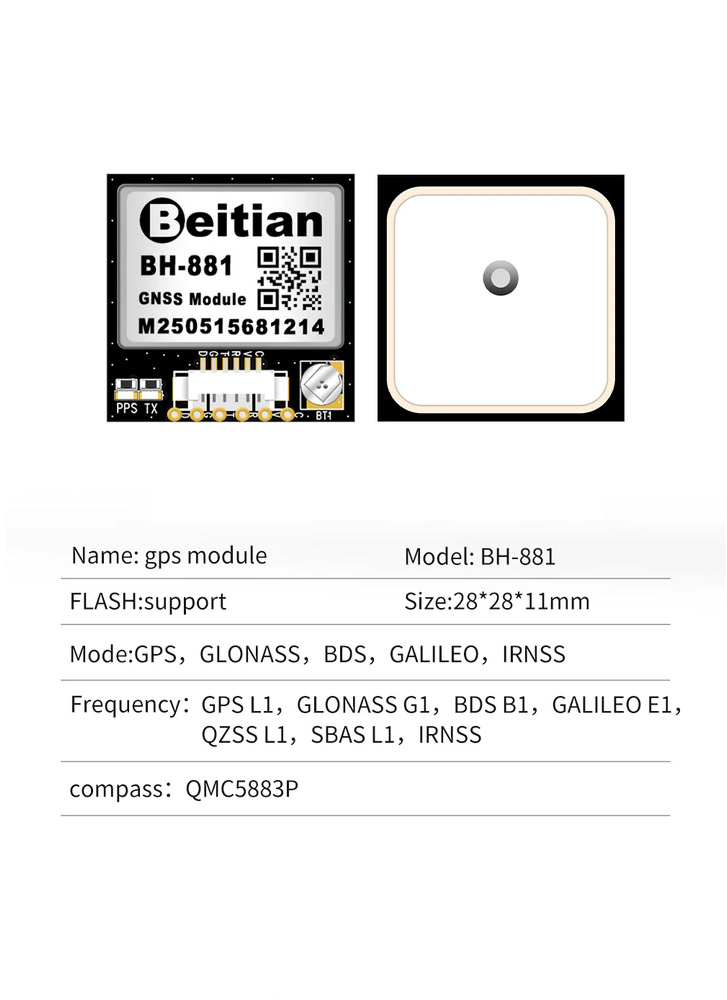 The BH-881 is an updated version of the popular BN-880, offering the same dependable GPS and compass functionality with newer hardware and a modern digital magnetometer. Itโs a great option for fixed-wing and multirotor builds, and works well with iNav, Betaflight (for GPS Rescue), and other autopilot firmware that supports the UBlox protocol used by most Beitian GPS modules.