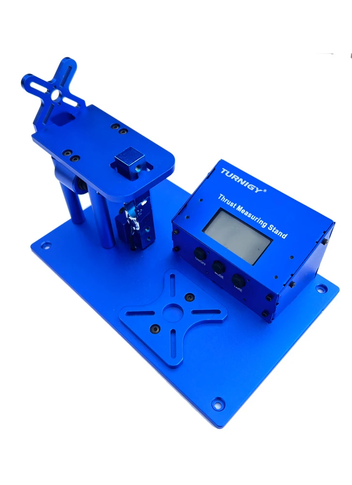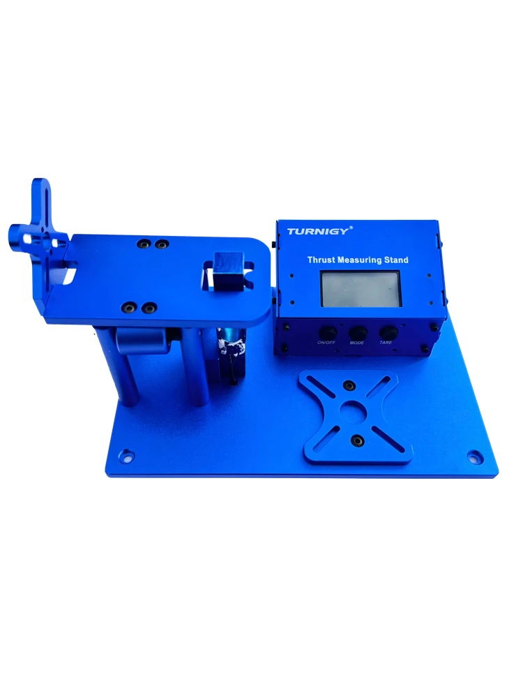 Optimize your motor/propeller combinations easily at home with the Turnigy Thrust Stand. This precision measuring device is a must have for the hobby enthusiast. The Turnigy Thrust Stand can handle a variety of motors from small to large. As this stand can measure up to 5 kg of thrust, it has been designed to be ultra rugged. All components including the heavy duty mounting base are made from CNC machined aluminum alloy. Holes in the base mean it can be secured to a table or work bench with screws for the ultimate security. High precision linear bearings and thrust sensor gives highly accurate thrust readings down to the gram. Included in the box is two different size motor mount adapters to take anything from ultra small, all the way up to 56mm outrunner motors. A bright, back lit LCD screen displays the thrust measurement for easy viewing.