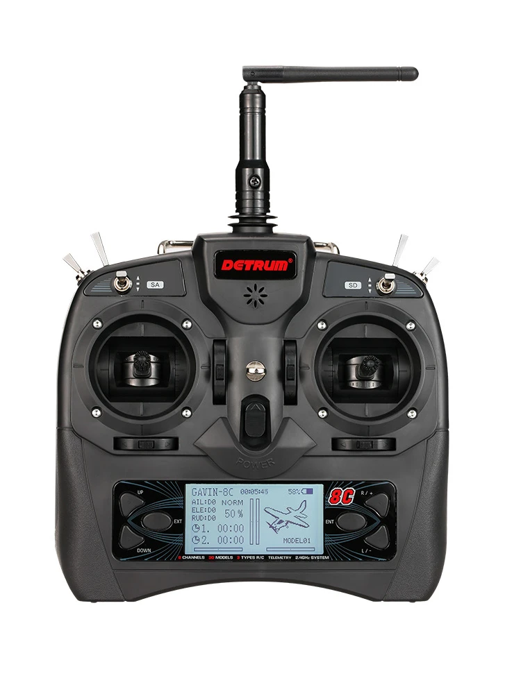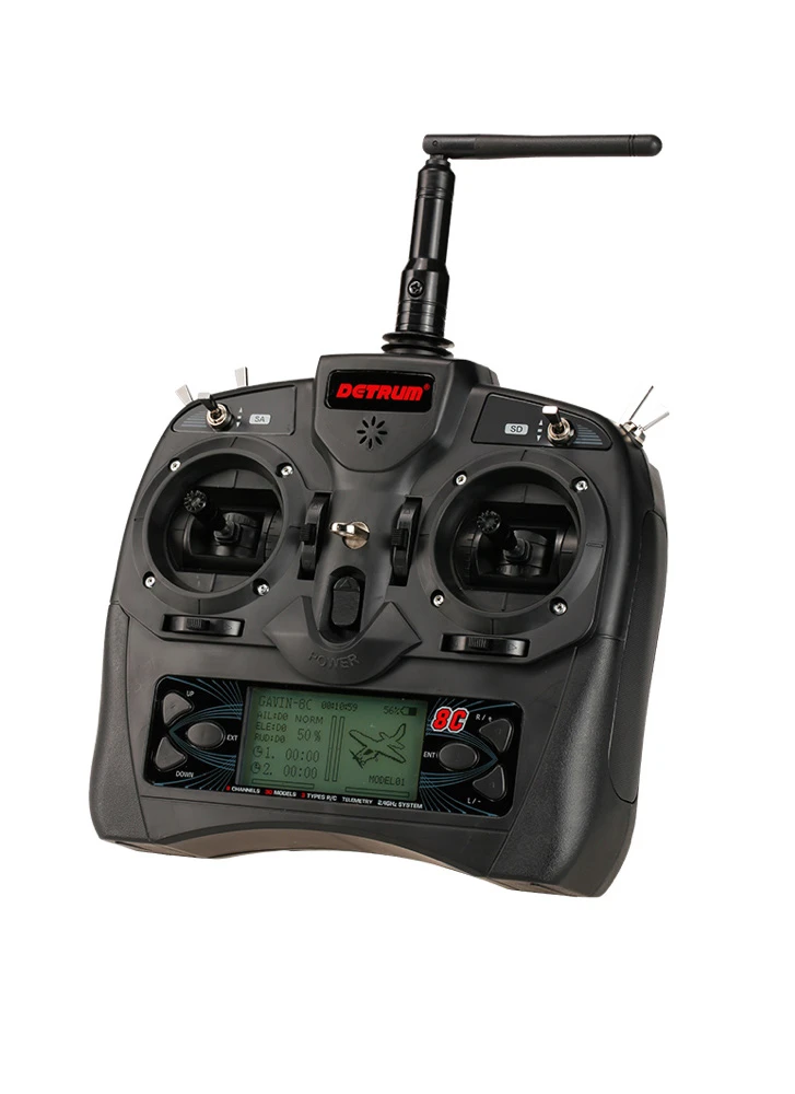 The Detrum 8C from Dynam is an 8 channel digital radio transmitter with a 30 model memory. The radio is the perfect starting point for beginner airplanes, helicopters and drones. Equally it has all of the main programing functions to mean that the radio will carry you through to more advance setups. Functions include configuration for servo end points, servo sub trim, dual rates, expo, throttle hold, pre-set mixes for different airplane types, a range of 2 and 3 position programmable switches, timers, failsafe support and a range test mode.