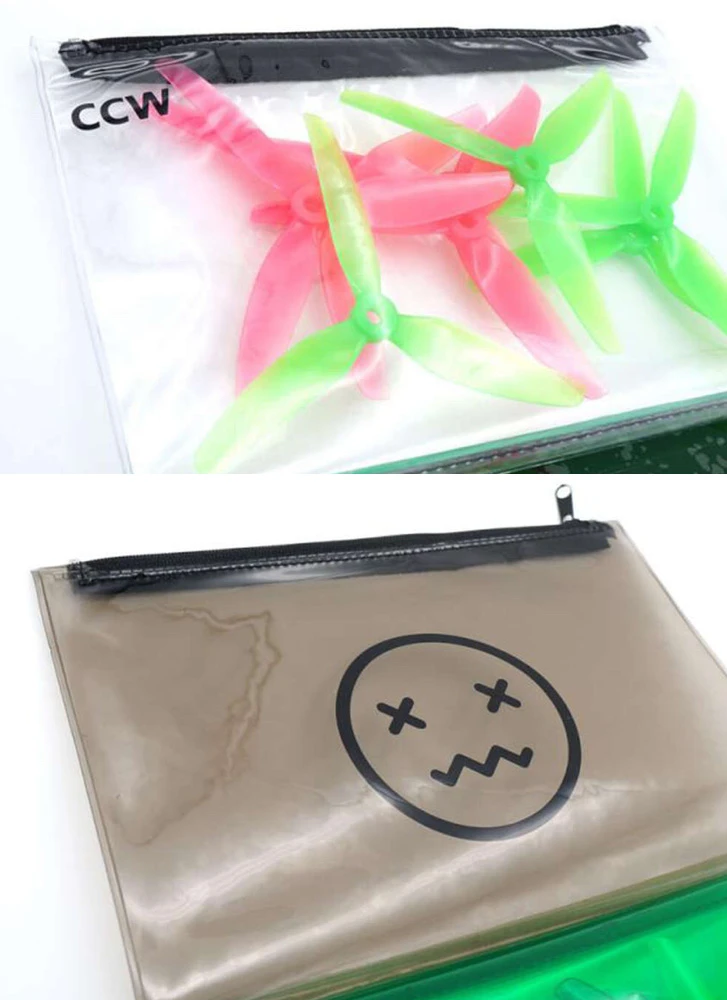 For most of us carrying a huge bag of mixed packs of 4 individually packaged props is the norm. Well, letโ€™s introduce some refinement to the prop carrying situation. Introducing the new Ethix โ€œback to schoolโ€ prop organization bag. This compact and lightweight book-like (stitched spin) set of bags allow for maximum prop carrying simplicity. There are 3 separate transparent zipper closed bags. Green for Clockwise props, Clear for Counter clockwise props, and smoked grey for those pesky bends and chipped โ€œbrokenโ€ props. Take the hassle of accidentally grabbing the wrong direction prop out of a loose bag-prop-pocalypse.