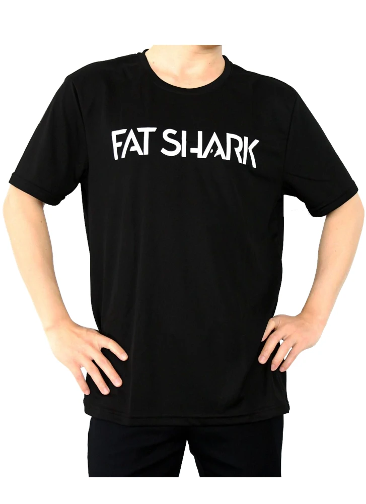 A genuine product of Fat Shark – aย black t-shirt with a printed Fat Shark Logo on the front.
