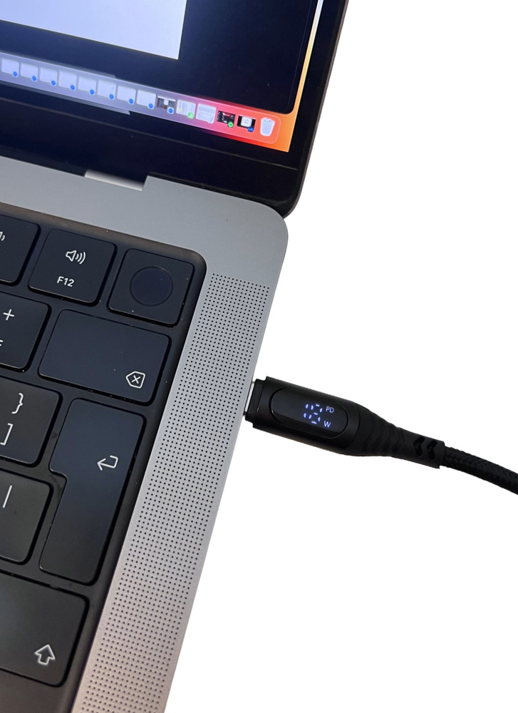 An integrated digital display shows real-time charging power, letting you quickly check performance at a glance — perfect for bench testing, battery charging, or troubleshooting USB-C power supplies. The braided outer jacket adds durability and resistance to everyday wear, while reinforced connectors help ensure long service life.