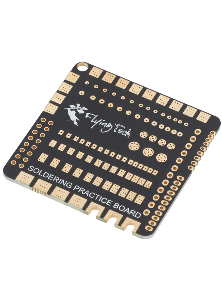Branded with the Flying Tech logo, the board offers repeated use from both sides, extending its lifespan and giving you more soldering variety in a single compact PCB. Supplied with a short length of solder to get started straight away, itโs ideal for beginners learning the basics as well as experienced builders wanting to sharpen technique before tackling a real flight controller or ESC. A corner loophole allows you to attach it to a keychain, making it easy to carry and practise anywhere.