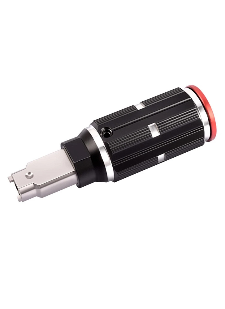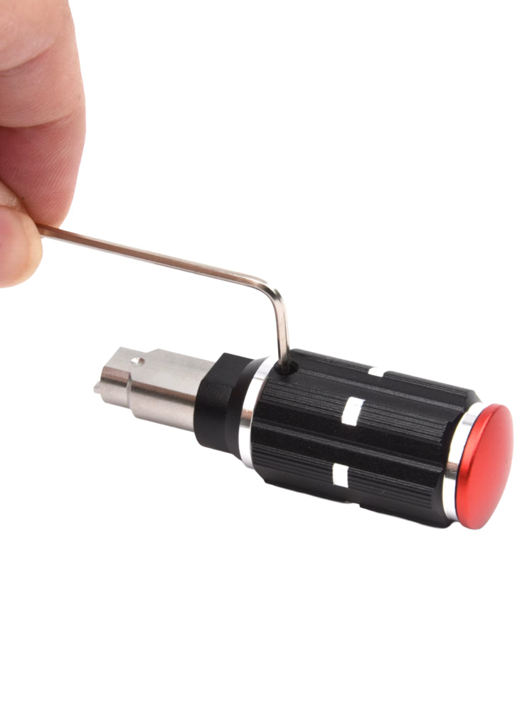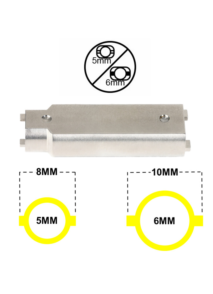 The tool features a reversible dual-size head with 5mm and 6mm ends, each providing slot widths of 8mm and 10mm. The prongs seat neatly into the grooves of standard M6/M7 switch nuts used across major transmitter brands, making it easy to handle everything from routine maintenance to switch upgrades.