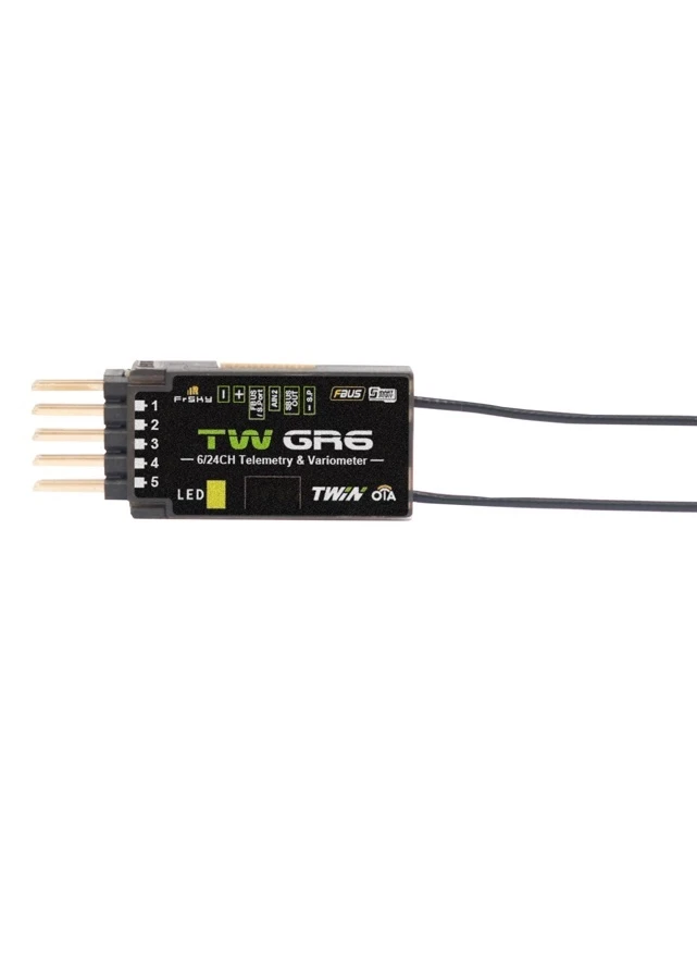 The FrSky TW GR6 is a 6 channel, dual 2.4GHz frequency receiver with built inย variometer. It hasย SBUS/FBUS/S.Port and 6 PWM output channels.