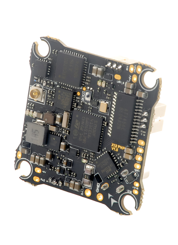 The Happymodel X12 ExpressLRS F4 12A 5-in-1 AIO is a compact all-in-one flight controller designed for high-performance 1-2S builds, including Tiny Whoops and Toothpick quads. It combines a powerful F4 flight controller, 12A 4-in-1 ESC (BLHeli_S), 2.4GHz ExpressLRS SPI receiver, 5.8GHz 40CH VTX (25โ€“400mW), and Betaflight OSDโ€”all on a 25.5×25.5mm whoop-style board.