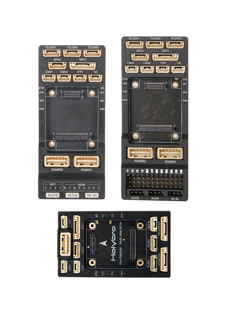 Official carrier boards for the Pixhawk 6X, 5X flight controller – Standard size and Mini versions.
