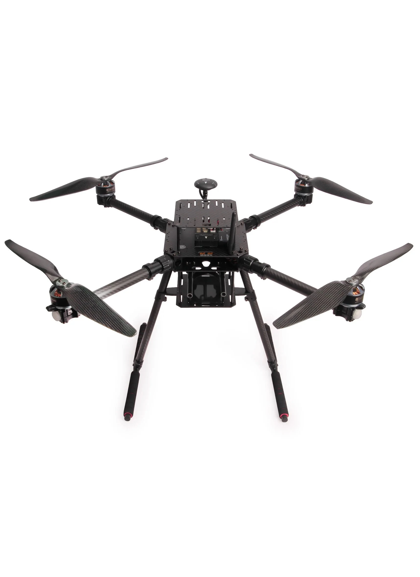 The Frame (X650) is made with full carbon fiber twill, with carbon fiber tube arms supported by the aluminum foldable arm connector. It is easy and straightforward to assemble. The landing gear consists of 16mm & 10mm diameter carbon fiber tubes with connectors that has been thickened and strengthened.