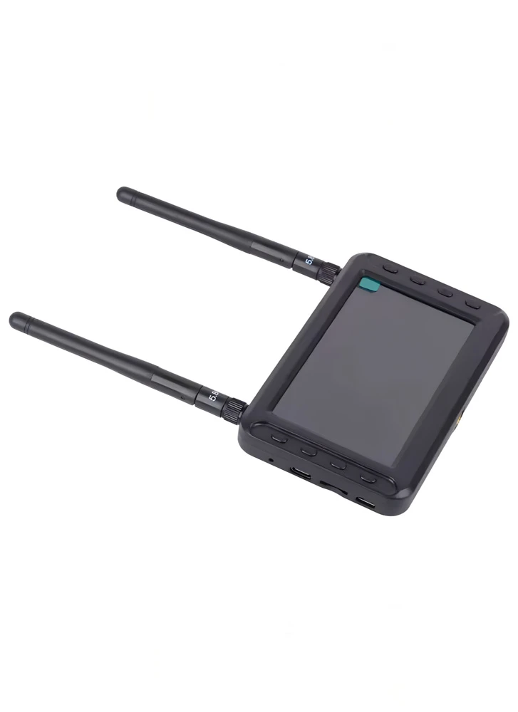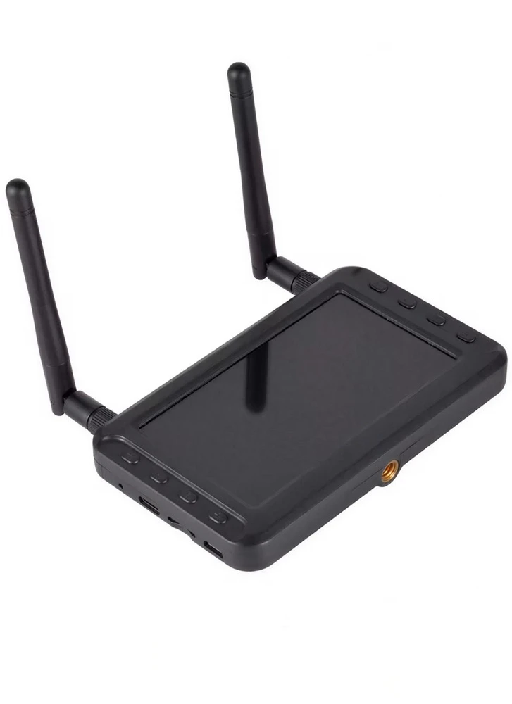 Compact 5.8GHz FPV display offering one-touch video and photo capture.