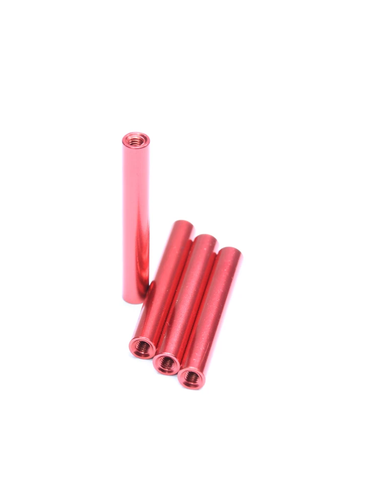These particular spacers are made from a lightweight aluminium alloy and are fully threaded to suit M3. We offer a range of sizes from 5mm to 85mmย in eleven differentย anodised finishes: black, titanium,ย silver, gold, purple, pink,ย red, orange, light blue, blue and green. Each pack comes includes a set of 4 spacers.
