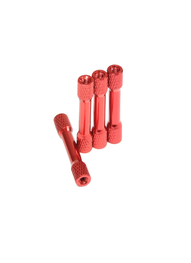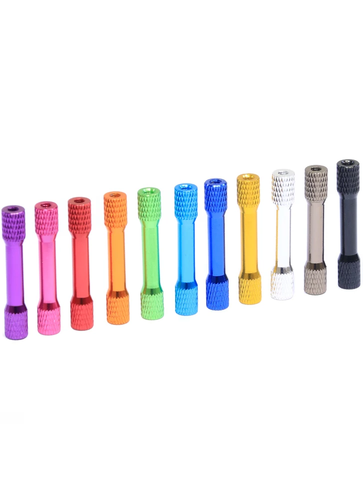 These spacers are partly knurled and made from a lightweightย aluminiumย alloy. Theyย are fully threaded to suitย M3ย screws. We offer a range of sizes from 20mmย to 35mmย in eleven differentย anodisedย finishes: black, titanium,ย silver, gold, purple, pink,ย red, orange, light blue, blue and green. Each pack comes includes a set of 4 spacers.