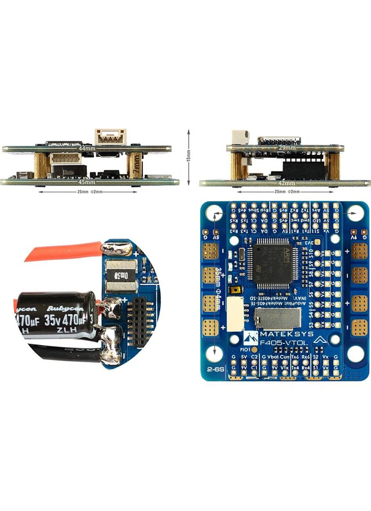 The Matek F405-VTOL Flight Controller is specially designed for VTOL (vertical take-off and landing) aircraft applications. It features a built in PDB that includes 5 separate motor/esc soldering points. With 12 PWM outputs in total, that leaves 6 outputs for servos or other PWM controlled devices. Furthermore the FC features a Barometer, BlackBox MicroSD, 6x UARTS, 4x ADC, 2x PINIO (Camera switch, P101 pad), 220A High-precision current sensor and a variety of onboard BECs for use with both servos and accessories. The FC is compatible with a wide voltage input 6.8-30V (2-6S LiPo). INAV and Ardupilot software are both supported. The board has both 25×25 and 35×35 mounting patterns and weighs 25g.
