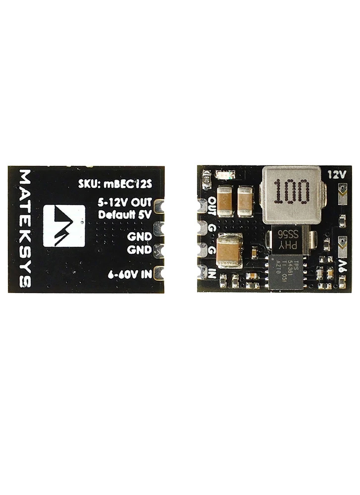The Matek Micro BEC 6-60V is a syncronous step-down converter with selectable 5V, 9V or 12V output (default 5V). The voltage output of this BEC is selected by a simple solder tab; by default it is set to output 5 volts.The Matek Micro BEC is rated for 1.3A-2.8A continuous current depending on input/output voltage.