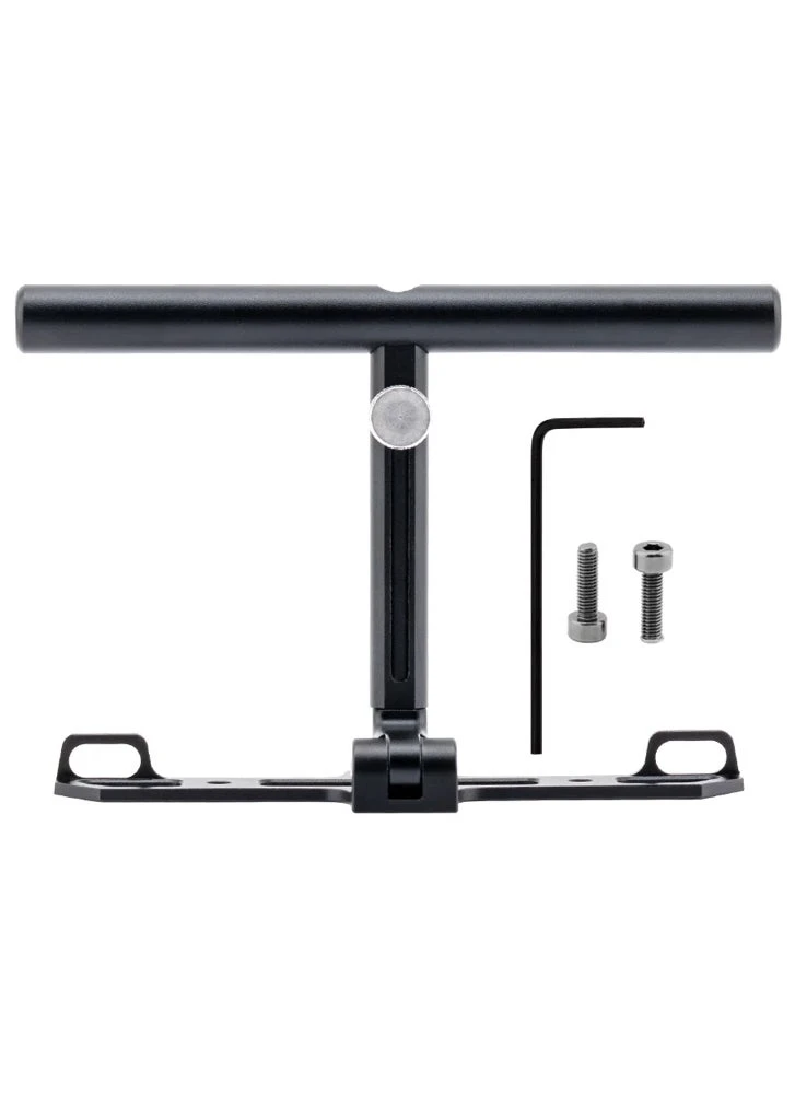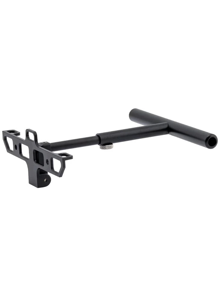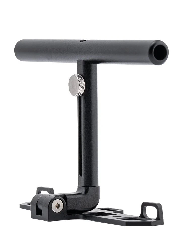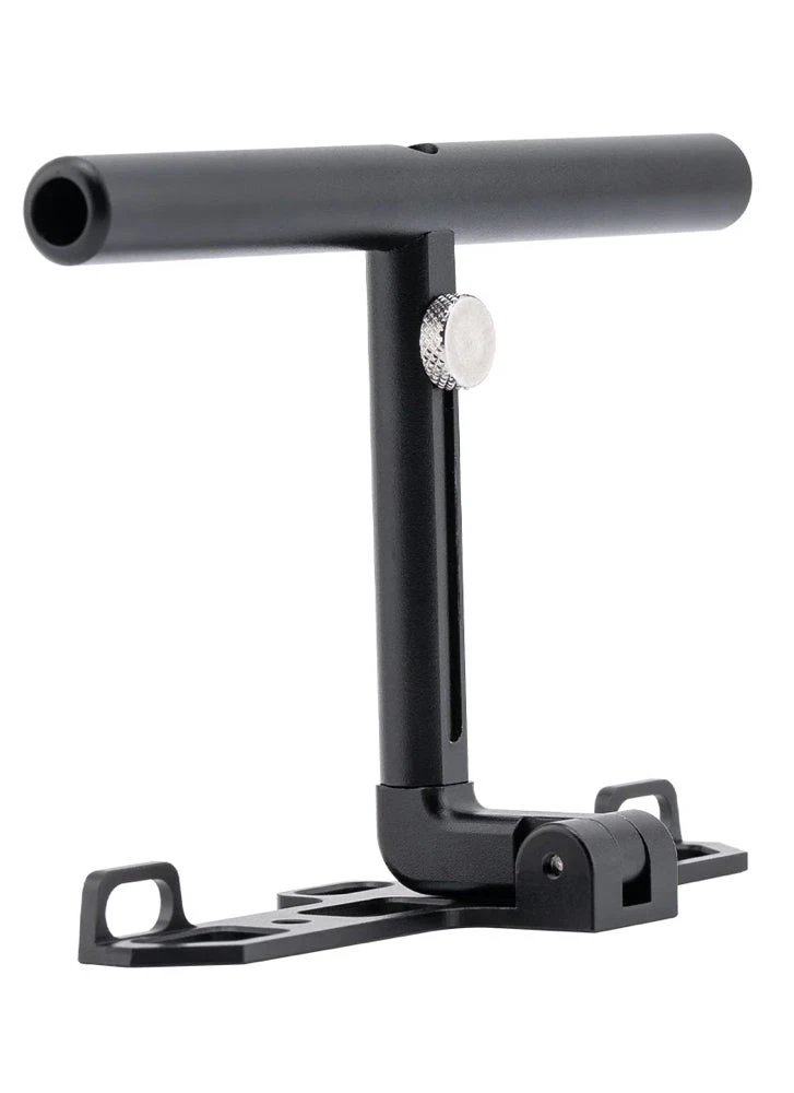The aluminum Multi-stand for the GX12 radio controller provides stable support against your abdomen, enhancing control and comfort. Featuring dual neck strap connection points, it positions the radio comfortably. When folded, the Multi-stand doubles as a convenient tabletop stand.