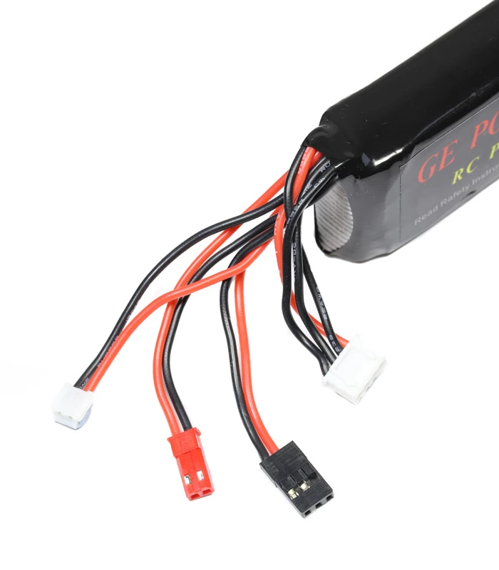 The pack features several plugs for compatibility with most radios. It has a JST plug for DEVO radios, a JR / Spektrum connection, a Futaba connection and finally a JST-XH charge port plug.