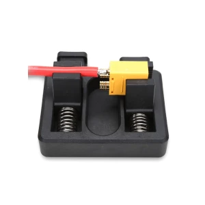 Itโ€™s made of carbon fibre and features a spring loaded clamping mechanism, which provides a firm hold but also makes it quick to use. It has been cleverly designed to hold anything from silicone wire to battery connectors. It features 2 vertical post pairs, spaced 25mm apart to clamp wires in place. It also has a rectangular self-clamping slot, which allows the jig to firmly hold male or female, XT60 or Dean type connectors in place. Finally there is a pair of round holes to suit bullet connectors, making soldering ESCโ€™s or battery connectors quick and easy.