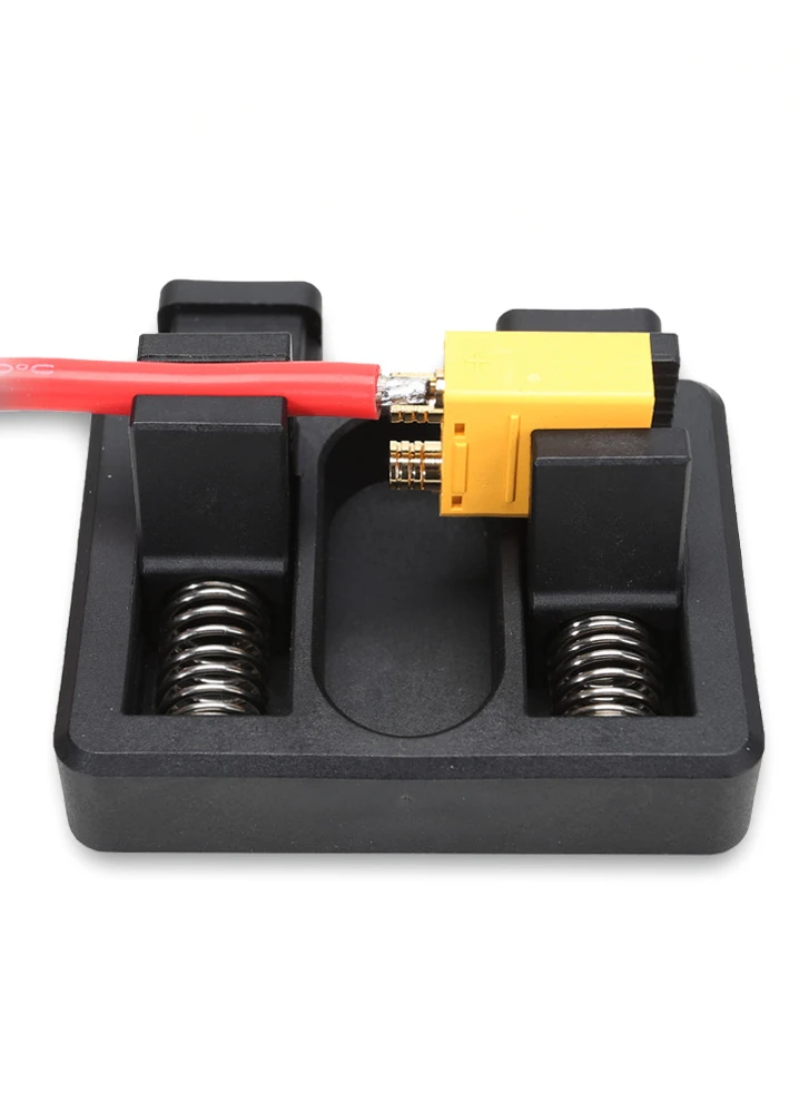 Take the stress (and hand-strain) out of soldering power leads and connectors with this Self-Clamping Soldering Jig. Designed for RC builders and makers, this injection-moulded jig features two independent spring-loaded clampa with a maximum opening of around 13 mm – perfect for gripping XT60s, Deans-style plugs, bullet connectors, and thick silicone wire without needing a third hand.