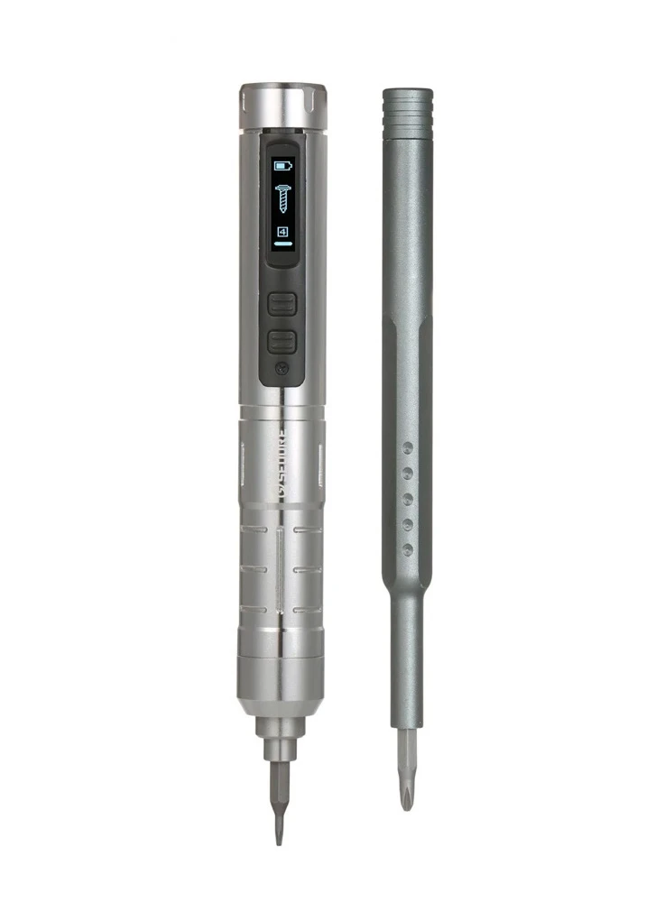 The screwdriver has a slim CNC’d 304 stainless steel body about the size of a marker pen and integrated into the front of it are three LEDs to illuminate the job you are working on. It is equipped with an OLED screen for a bright clear display, which shows the working status, battery level, and load of the driver. It has a built-in 320mAh battery for wireless operation and fully charged it will give up to 60 minutes continuous use, which is plenty for a normal dayโ€™s usage. Recharging it is straightforward, itโ€™s USB-C powered so just plug it into a computer or phone charger.