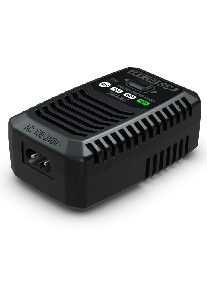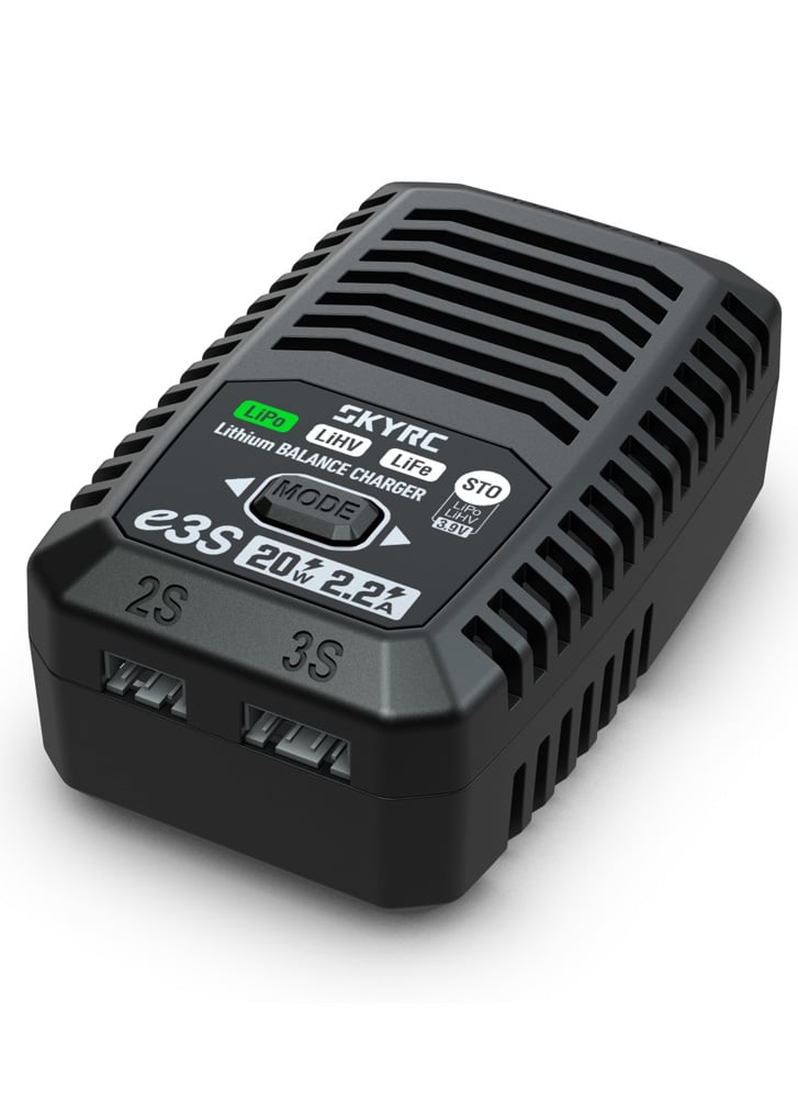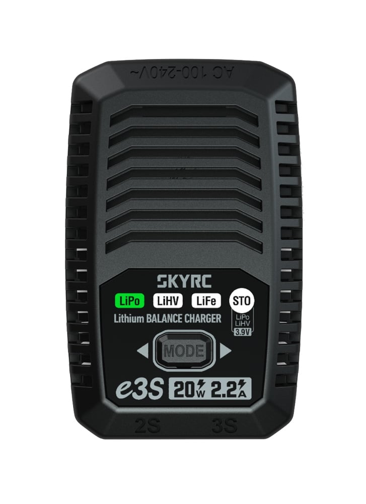 The SkyRC e3S is a compact AC balance charger designed for 2-3S LiPo, LiHV, and LiFe batteries. Delivering up to 20W of power, it charges 2S packs at 2.2A and 3S packs at 1.6A, ensuring fast, efficient charging with automatic cell balancing. Operation is simple — just plug in the balance lead and the e3S takes care of the rest. It also includes a storage mode to help maintain battery health between uses. With clear LED indicators, global 100-240V AC compatibility, and a durable, lightweight design, the e3S is an ideal everyday charger for hobbyists and FPV pilots alike.