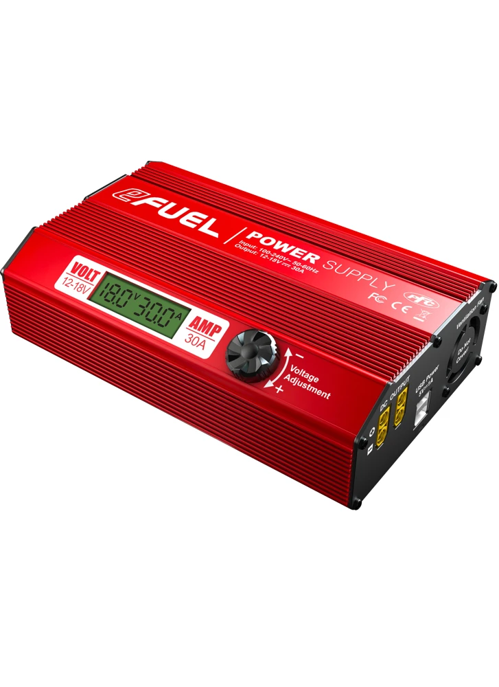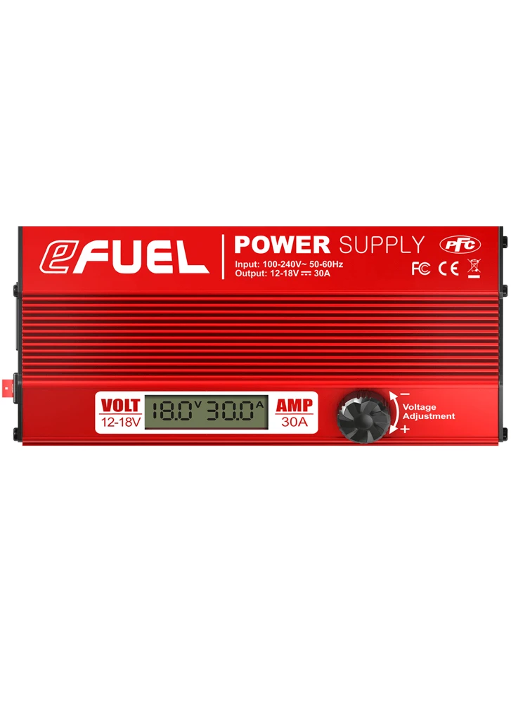 The eFUEL switching DC Power Supply is designed to use household AC power source to power equipments that required DC power. The eFUEL converts standard household power 100-240V AC to 12-18V DC power and can supply up to 30 amperes of continuous power.