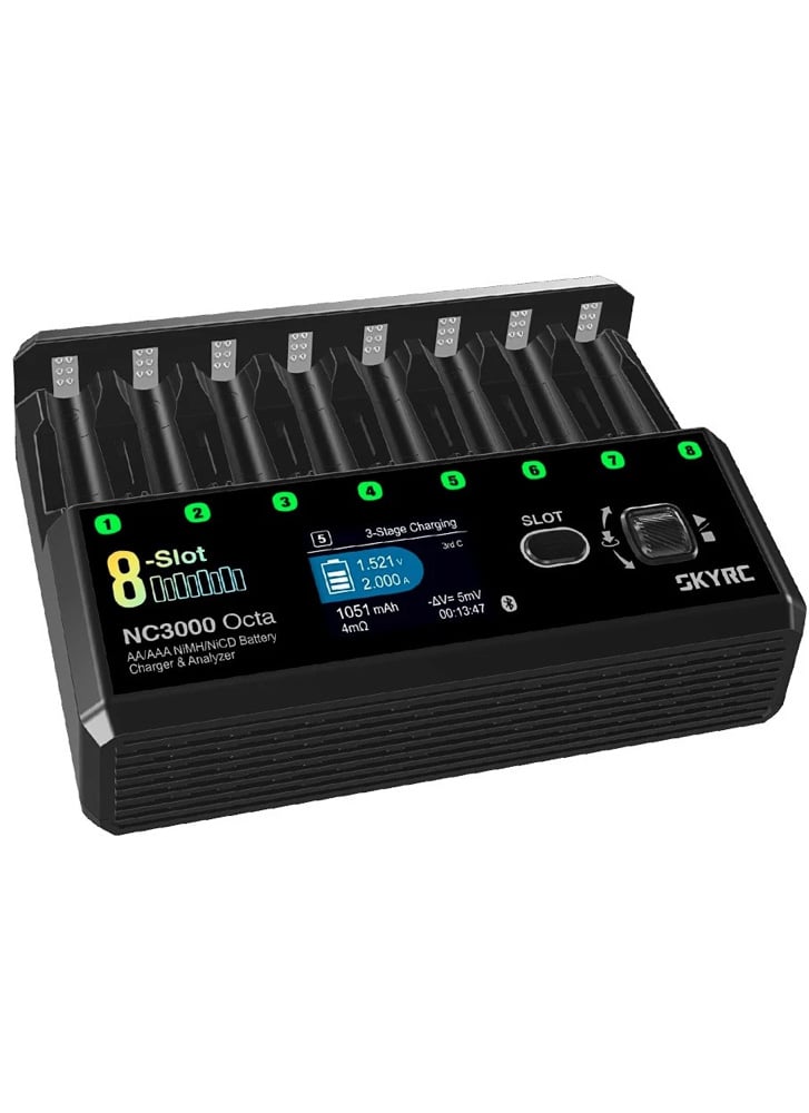 The SkyRC NC3000 Octa is an advanced eight-slot charger designed for charging, analysing, and maintaining AA and AAA NiMH or NiCd batteries. Each slot operates independently, allowing you to charge, discharge, or test up to eight cells simultaneously while applying different settings to each battery.