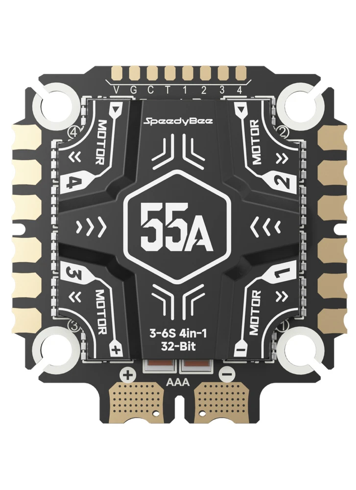 Paired with the flight controller is the SpeedyBee OX32 55A 4-in-1 ESC, designed for powerful freestyle and racing setups running 3–6S LiPo batteries. The ESC supports DShot protocols and ESC telemetry, and includes a built-in TVS protection diode to help reduce voltage spikes and improve reliability in high-power builds.