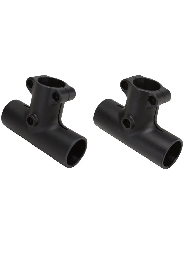 A pair of landing skid T-Joint Adapters, made of reinforced plastic. The adapter fits 16MM diameter tube for both the skid and leg.