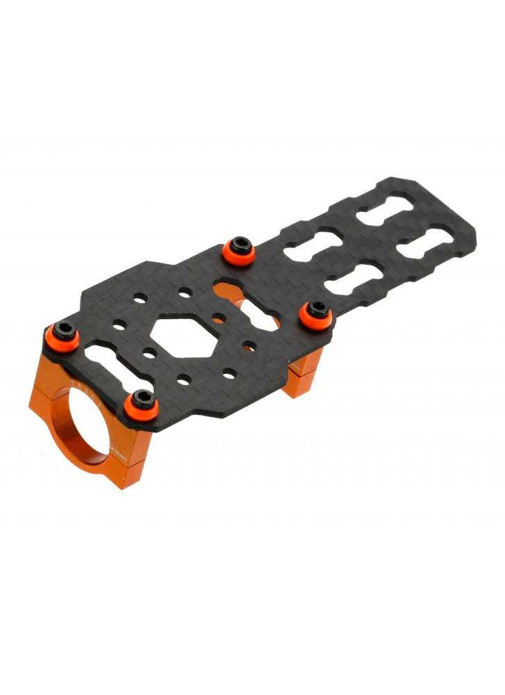 This motor mount has holes to suit motors with M3 19MM/25MM hole mounting patterns. It is made from quality carbon fibre and has CNC machined anodised aluminium tube mounts. The carbon plate has been designed with room to attach an ESC inline with the motor.
