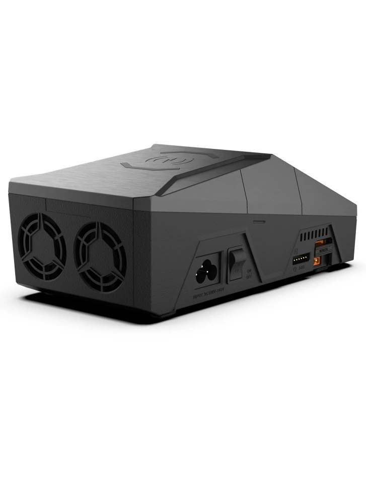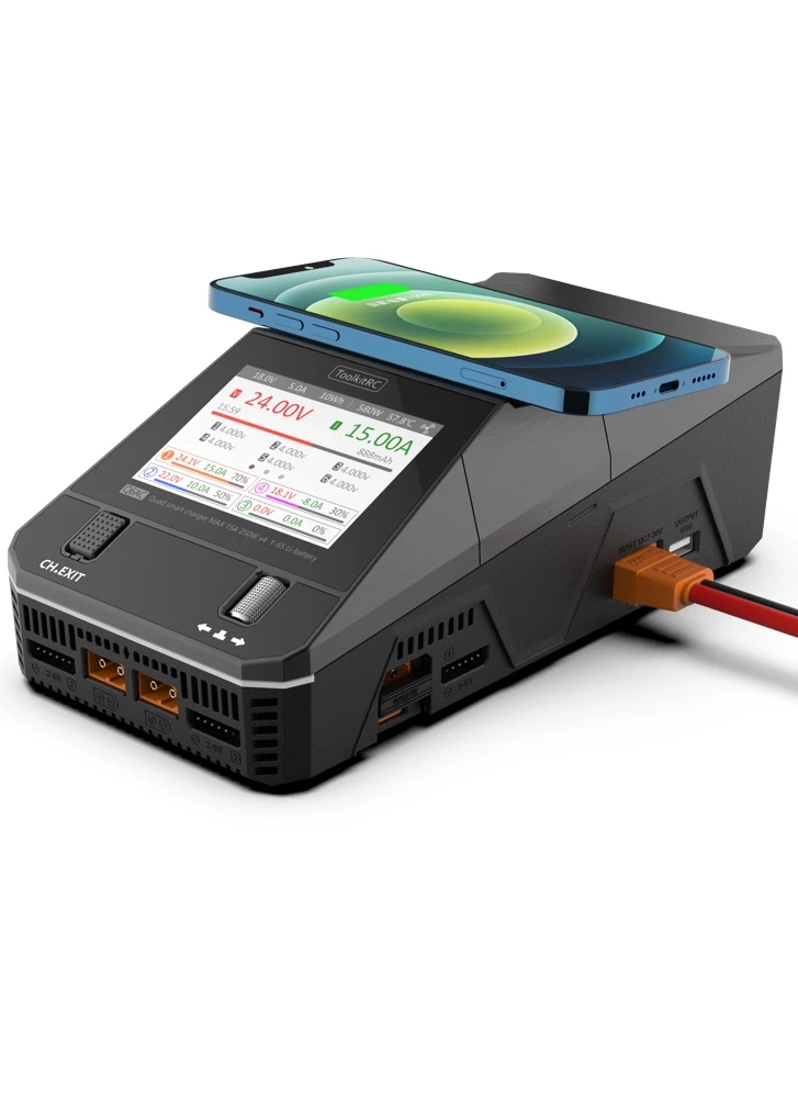 This is the ToolkitRC Q6AC Quad AC/DC Smart Charger. It’s compatible with a variety of battery types including LiPo, LiHV, LiFe, Li-ion, NiMH, and Pb. Packed with features, the Q6AC is a supreme multifunctional and a user friendly charger that can do it all! From charging big capacity batteries to wirelessly charging your phone and other personal electronics! With four independent charging ports, it offers the convenience of parallel charging without the associated limitations.