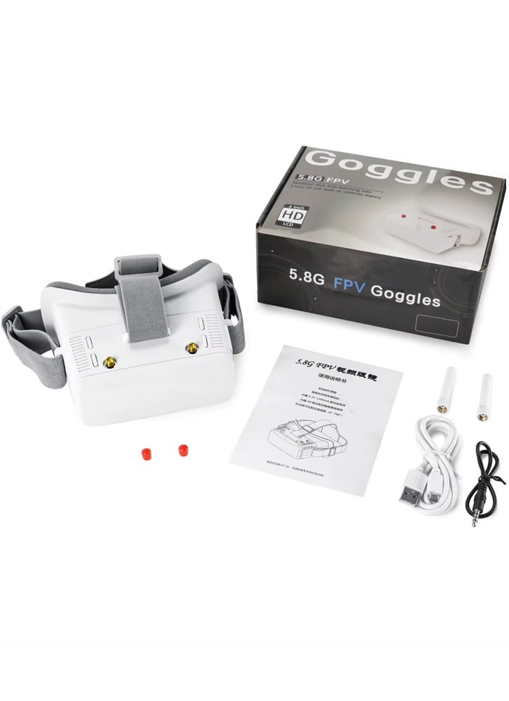 3-inch FPV box goggles with focus adjustment and integrated 5.8 GHz analogue receiver.