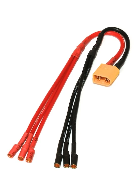 Theย cable comes preย terminated with an XT60 battery input and terminates in 3 pairs of 3.5mm female gold connectors. Wiring is high qualityย silicone insulationย 14 Awg – splittingย into 18 Awg.