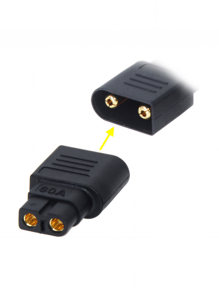 A compact, one-piece XT60 to XT90 adapter with solid brass contacts for a clean, low-resistance connection without wires.